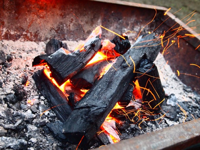 炭火を囲んでのバーベキュー。おいしいお酒に校庭に響くゆらりとした音楽。