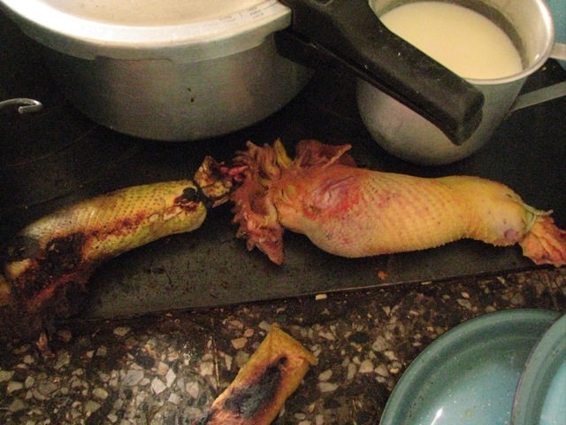頭を切り落とし、皮膚に残った毛を焼く。