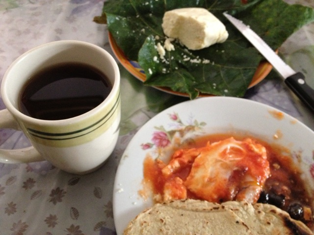 ケソ(ぱさぱさしたチーズ)、そしてチリモル(トマトと唐辛子、タマネギ、レモン、パクチーのソース)の組み合わせの朝食。