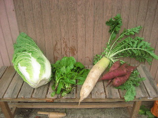 もらったほうれん草、掘った紫芋、前日に前の畑のお母さんからもらった白菜と大根と、大収穫。全部自分で育ててないや。