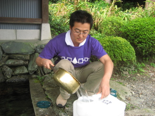 こんこんと湧き出る水を汲む