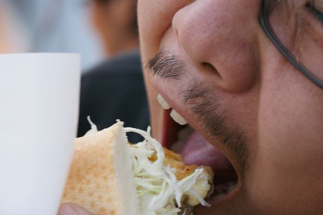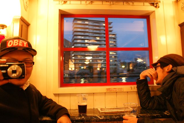 出発までの20分、友だちはしっかり職員のおじちゃんにフェリーのどこのポジションがいいかを聞いていた。おじちゃんも慣れたもんで、「下町を見るなら右側、近代的な夜景を見るなら左側。後ろのデッキは寒いけれど、景色が一番いいね。そこで、ビールがあればなお良い。」と、まるで僕らの気持ちを読んでいるような回答をしてくれる。待ち時間にソフトクリームで腹ごしらえ。友だちが食べていたチーズステーキバーガーはスパイスが利いていて美味。